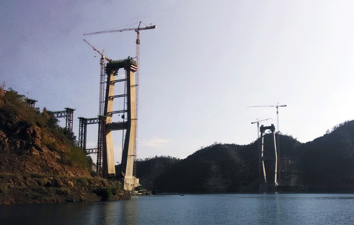 紅水河特大橋兩側橋墩高度均為210米,每個橋墩的起重機械配置均為川建生產的一臺C7036塔機、一臺C7030塔機和兩臺SC200/200WPZ中速變頻施工梯,副墩的施工機械為一臺P125平頭式塔機。